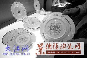 2005年11月29日,记者在陶瓷股份展示大厅看到了由该公司和景德镇陶瓷学院共同为老布什设计的结婚60周年纪念瓷。这套纪念专用瓷是由老布什回赠的。三块瓷盘反面的中央分别印有“喜、福、寿”和“60周年”的汉字及英文。