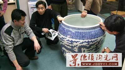 这只大缸近1米高,直径有六七十厘米,缸身有五爪金龙和云纹花饰。据该公司负责人鲁智勇介绍,这是迄今为止我国发现的最大的明代青花瓷缸。景德镇龙珠阁博物馆存有一件类似的宣德大缸,可惜是用残破的瓷片拼成的,而且比即将拍卖的这只小。鲁智勇透露,这只大缸原本保存在景德镇附近某明代王府的老宅中,8年前,一位武汉的收藏家,以极低的价格买下这只大缸。谁知,那位藏家将大缸运回武汉后,却因缸体太大,无法进门,只得存放在郊区农村的一所柴房中。鲁智勇见到这只大缸时,只见柴房不远处就是一处猪圈,大缸蒙着一块白布,放在角落里。