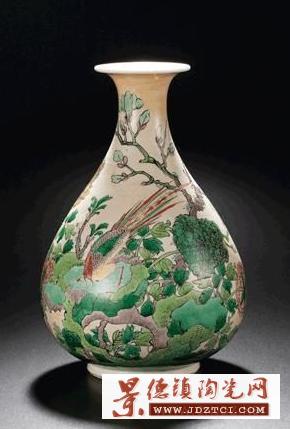 此件玉壶春瓶撇口,短颈,颈以下渐向外阔,至近底处内敛,圈足微外撇。其腹部浑圆大气,身形挺拔壮硕,予人典雅尊贵之感,有明显继承明末玉壶春瓶式 的痕迹,线条圆润敦实,少了一丝秀雅,多了一份雄浑,瓶身通体上米色釉,上釉旋转痕迹明显,主体纹饰于米黄色釉上以五彩绘洞石锦鸡玉兰牡丹纹,寓意锦上添花,玉堂富贵,所绘纹饰工细,全部图案均以墨线描边,然后在轮廓内填彩。纹饰图案繁复工整,于锦俏热闹之余,尚有一丝文人画气息,灵动鲜活,惹人喜爱,而此瓶之纹饰与釉彩装饰,则相对特殊,色地加彩在康熙之前的五彩器物中比较少见,明代曾有罐、炉一类以红绿彩为地的彩绘器,但装饰手法较为单一,所用颜色也相对简单,而此件器物则安排了绵密繁复的图案及画面,雉鸡纹的形象源自中国特有的鸟类红腹锦鸡,其翎羽华丽,色彩鲜艳,因极具装饰效果,所以古人常以之入 画,又因为其色彩华丽,又有锦绣繁华之意,配合其周边所绘的竹石牡丹及玉兰花卉,寓意吉祥,此图案为康熙朝经典装饰纹样,在青花及青花五彩器物中反复出现,可资参阅的例子也较多,后世有所继承。在米釉上绘五彩纹饰为康熙朝新创装饰方法,殊为罕见,即便是康熙本朝器物,也不为多见,因与之相类者寥寥,所以此风格的玉壶春瓶于拍场更是十分稀见,目前已知北京故宫博物院有一件清宫旧藏的米黄釉五彩玉壶春与之风格相同,但纹饰有所差别,高度略高于本件,且瓶底同 样无款。