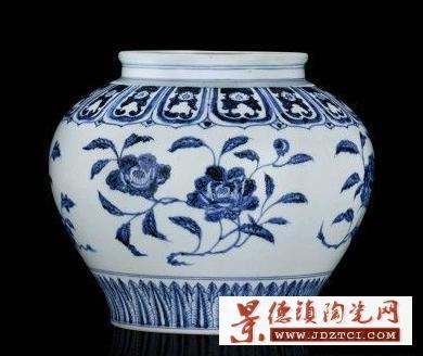 此罐是明代瓷器装饰风格的典范。一改元青花的繁密华缛而代之以疏朗清秀,缠枝花卉于莲瓣纹予人一种高雅大方的美感。纹饰与优美的罐体相衬,愈显宫廷 奢华之气,展示了景德镇官窑匠师非凡的艺术才华。整器用进口的“苏麻离青”料绘制,笔法活泼流畅,线条粗细并用,彩料浓淡兼施。且不论着色深浅,纹饰效果 皆极为绚丽鲜艳、清新明快。在线条的纹理中布满钴铁的结晶斑点,呈星状点滴晕散,彩料浓重处则凝聚成黑青色结晶斑。正因为青料此一特性,令画面富于水墨画 般挥洒淋漓、苍翠欲滴的意趣。所形成的此种艺术效果,“苏麻离青”料固然是一方面原因,但更主要的还是匠师自身所具备的艺术修养与绘制技巧。每组花卉的形 态均系以极富中国画传统笔墨意韵之勾、勒、点、染等技法绘就,画笔细腻传神,表现出枝叶的翻转扭曲、偃仰起伏之态;花、枝、叶间的疏密聚散同样是借鉴了国 画的结构布局,得其法度,极富写实效果,充分体现了匠师扎实深厚的笔墨功底;疏密有致的铺排在视觉上亦形成了张弛有度的艺术效果。
