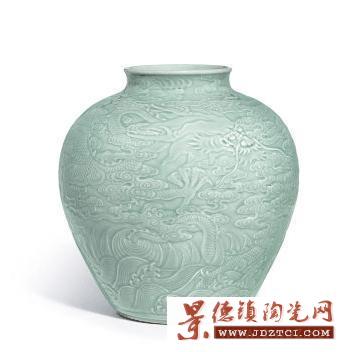 NO.6、清乾隆《粉青釉浮雕“苍龙教子”图罐》成交价:74,512,200元,刷新了单色釉拍卖纪录。